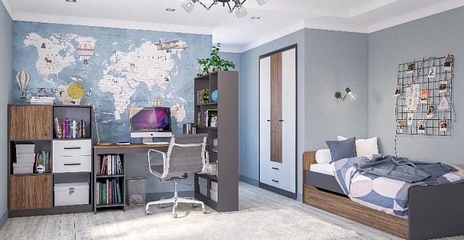 Коллекция Мальма для кабинета или молодежной комнаты создана белоруской фабрикой Неман. Выполнена в стиле минимализм, что характерно для этого стиля: функциональность и нейтральное цветовое сочетание.