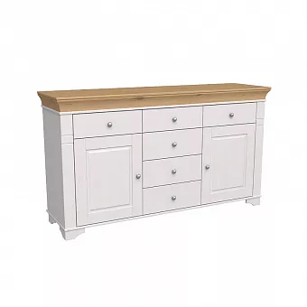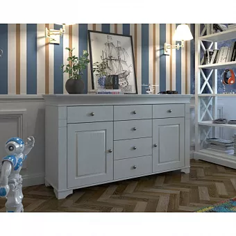 Комод из массива сосны. Имеет 6 ящиков на роликовых направляющих и 2 двери. За каждой дверью расположена полка.