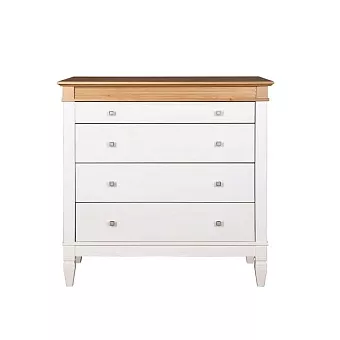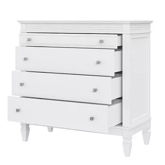 Комод оснащен четырьмя широкими ящиками. Фурнитура на ящиках с доводчиками. Высокие ножки обеспечивают оптимальный доступ при уборке.