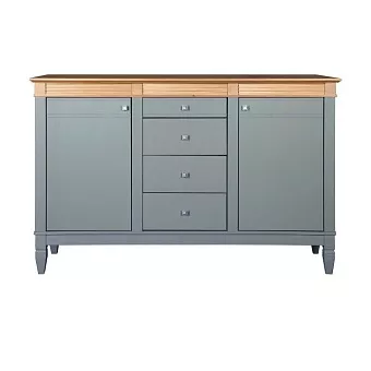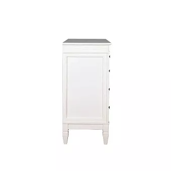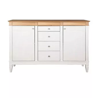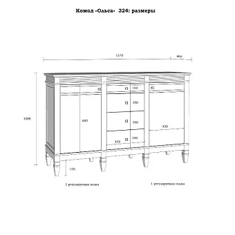 Комод оснащен двумя распашными дверками с полками внутри и четырьмя ящиками. Фурнитура на дверях и ящиках с доводчиками. Высокие ножки обеспечивают оптимальный доступ при уборке.