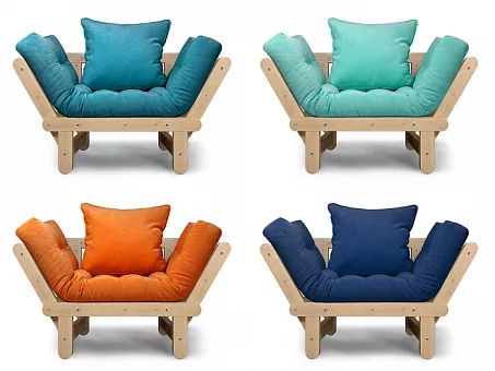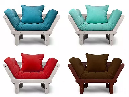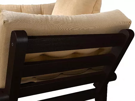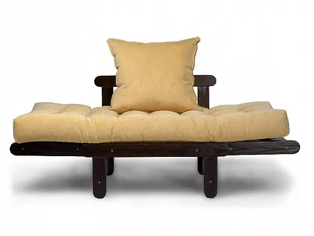 Данная модель выполнена в оригинальном виде из массива дерева с откидными подлокотниками, мягким матрасом и приспинной подушкой.