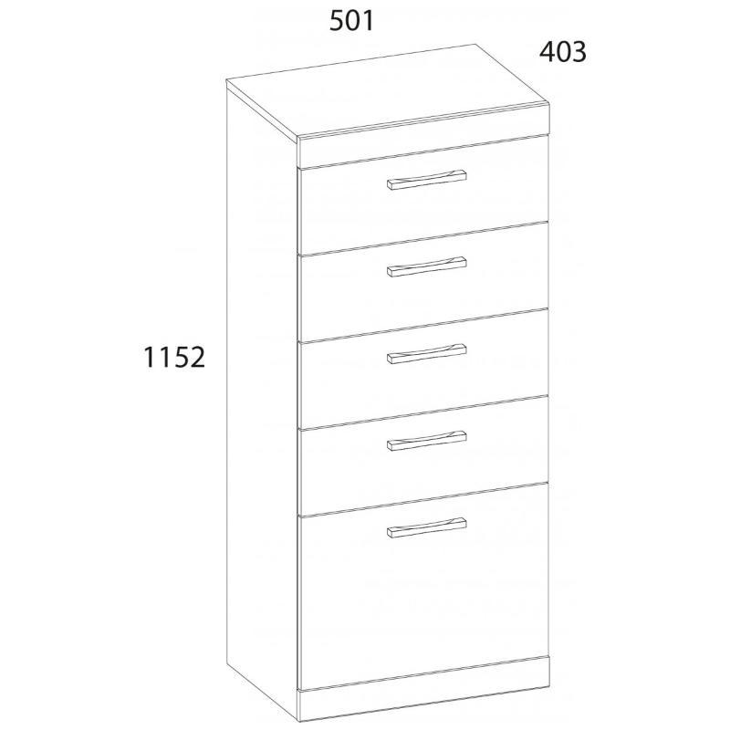 Комод 5S/50 OSKAR создаст современный и уютный интерьер спальни, молодёжной комнаты, прихожей, даже с небольшой площадью, так как ширина изделия – 501 мм. Комод 5S/50 имеет прямую конструкцию. Конструкция элемента представляет собой пять выдвижных ящиков, расположенных друг над другом.