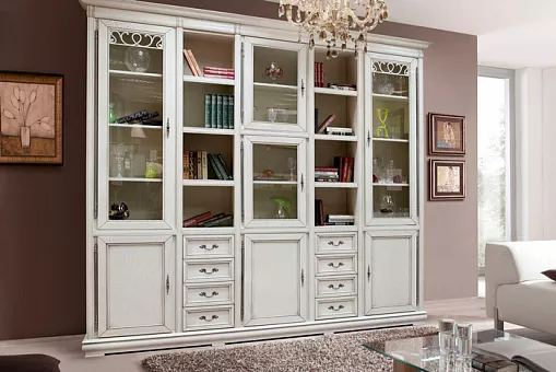 Набор для библиотеки – продолжение программы «Оскар». Те же изогнутые линии, искусные кружева, налёт старины на шкафах предназначенных для хранения книг, сувениров, альбомов и других дорогих для сердца вещей. Прекрасным дополнением идёт к шкафам письменный стол с широкой рабочей поверхностью, маня к себе многочисленными ящиками .