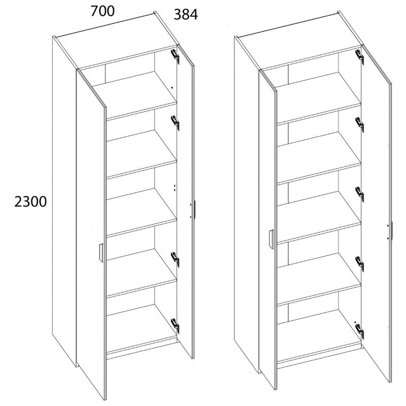 Шкаф 2D/70 MODERN может выступать как самостоятельный организатор хранения предметов одежды и вещей, так и быть дополнением к основной шкафной группе в интерьере любой комнаты. Конструкция шкафа 2D/70 MODERN прямая, представляет собой одно отделение с полками ЛДСП за двумя глухими дверями (2D). Двери распашные, крепятся на петли к боковому корпусу изделия. Кодировка «70» обозначает ширину изделия. Двери имеют разные параметры ширины. Особенностью элемента является компактность и универсальность, использование петель с доводчиками, практичная матовая текстура – персидский жемчуг.