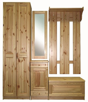 Серия мебели «Константин» от фабрики «Добрый мастер» создана из мебельного щита (массив сосны) и выполнена в стиле кантри. Фасады изготовлены из мебельного щита сорт "Экстра" (бес сучковая сосна). Изделия покрыты бесцветный нитроцеллюлозный лак, который подчёркивает естественную красоту сосны, делая мебель тёплой и уютной. Прихожая «Константин» это элементная база, из которой можно собрать индивидуальную прихожую для вашего дома. Мебельная фабрика "Добрый Мастер" производит полный ассортимент мебельных элементов для комплектации прихожей: четыре типа вешалок для одежды, два типа шкафов, для верхней одежды или с полками для различных надобностей, тумба для обуви с верхней крышкой, которая позволяет садиться на тумбу, чтобы одеть обувь, а так же тумба под различные мелочи и ключи, и конечно же зеркало над тумбой. Материал корпуса: