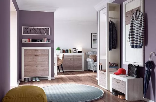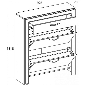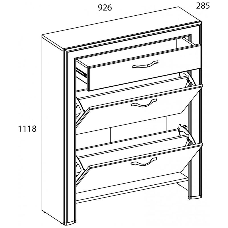Тумба для обуви 2D1S OLIVIA – элемент, выполняющий сразу несколько функций в прихожей – организация хранения обуви и других вещей в выдвижном ящике, сохраняет пространство, не занимая полезную площадь. Тумба для обуви 2D1S имеет прямую конструкцию. Конструкция элемента представляет собой один выдвижной ящик (1S), два отделения для хранения большого количества пар обуви (глубина 285 мм) за откидными дверями (2D), внизу по конструкции представлена ниша для дополнительного количества обуви.
