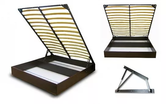 2. Бельевой ящик с подъёмным ортопедическим основанием вставляется в каркас любой кровати, предусматривающий использование ортопедической решётки , стоящей на своих ножках или лежащей на предусмотренных конструкцией кровати упорах.