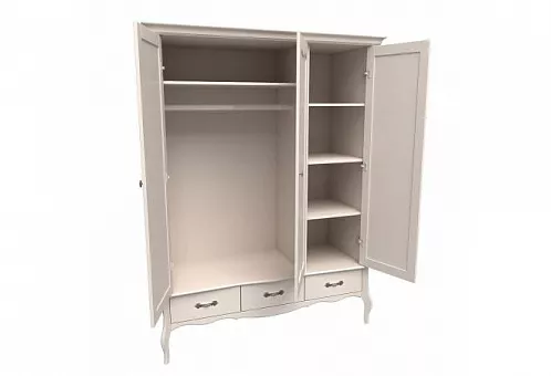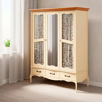 Шкаф с 3 дверями и 3 ящиками из массива сосны. Покрытие - укрывистый бежевый воск, структура древесины почти не просматривается. Шкаф имеет два отделения, правое узкое отделение с полками, левое широкое с полкой и штангой для одежды. Три ящика на направляющих Blum с доводчиками. Возможна установка дополнительных полок и ящиков для белья (приобретаются отдельно). Шторы в комплект не входят. Шторки в комплект не входит.