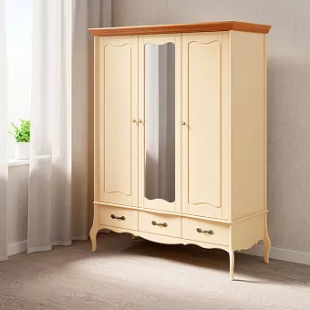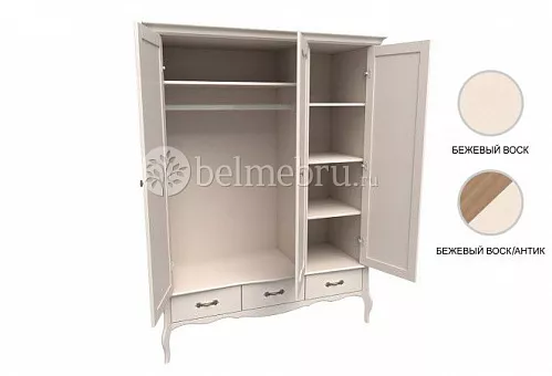 Шкаф с 3 дверями и 3 ящиками из массива сосны. Покрытие - укрывистый бежевый воск или бежевый воск/антик в цвет антик окрашен карниз шкафа. Структура древесины почти не просматривается. Шкаф имеет два отделения, правое узкое отделение с полками, левое широкое с полкой и штангой для одежды. Три ящика на направляющих Blum с доводчиками. Возможна установка дополнительных полок и ящиков для белья (приобретаются отдельно).