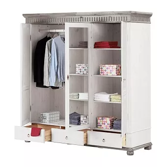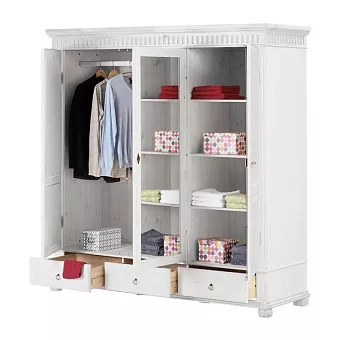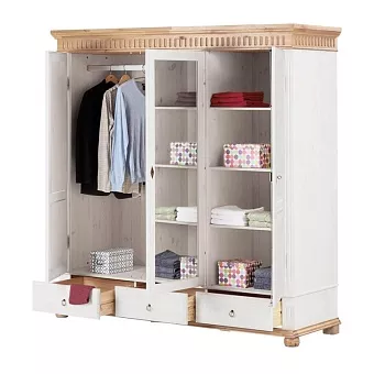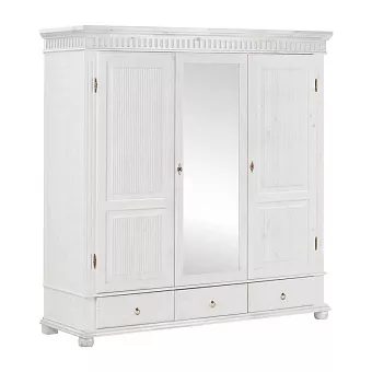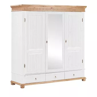 Трехстворчатый шкаф “Хельсинки 3SP GT из массива сосны с зеркалом” - идеальное решение для большого гардероба. Внутри имеется вместительное пространство для одежды со штангой и две секции с 4 полками каждая, а также три выдвижных ящика внизу. Дверь посередине оборудована зеркалом в полный рост. Все двери можно запереть на замок, благодаря чему вы сможете быть уверены в сохранности своих вещей!