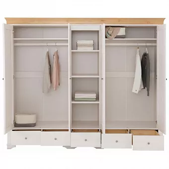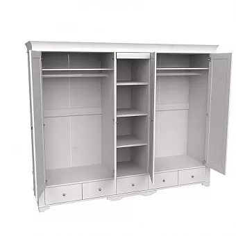 Шкаф из массива сосны. Имеет 3 отделения: правое и левое широкие отделения с полкой и штангой под ней, среднее широкое отделение имеет 3 полки, которые регулируются по высоте. Под каждой дверью имеется выдвижной ящик на роликовых направляющих.