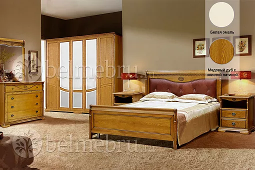 Благородная древесина дуба, резной орнамент, плавные линии брусков, фурнитура с оттенком старины, мягкая спинка кровати создают атмосферу покоя и защищённости. Стол туалетный в виде трельяжа будет находкой для тех, кто любит следить за своей внешностью, так как он позволяет оценить ее не только спереди, но и со всех сторон.