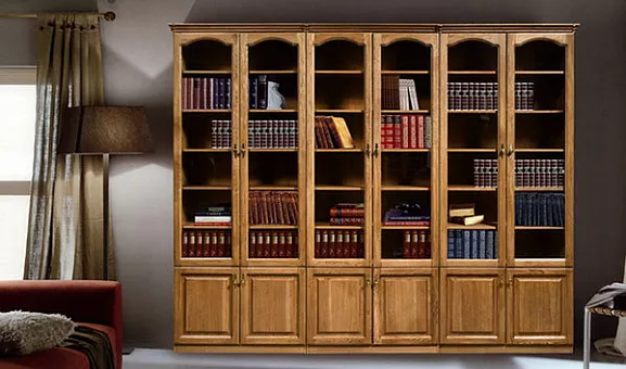 Шкаф для книг ГМ 2312-07 Вариант 03 (отдельностоящий петли слева) Фасады -дверки выполнены из МДФ шпонированного натуральным шпоном дуба. Боковые стенки из ДСП сверху шпонирование натуральным шпоном дуба. Карнизы массив дуба. Полки внутренние несъёмные за стеклянной дверцей. В нижнем отделении за закрытыми дверцами одна съёмная полка. Изделие набирается в модульную программу любого размера.