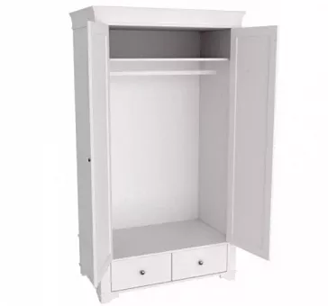 Шкаф имеет одно отделение за дверями, два выдвижных ящика на роликовых направляющих, полку и штангу под ней для одежды. Для разделения шкафа на отделение с полками и отделение со штангой можно дополнительно приобрести встраиваемые полки, арт. 87409. Изделие выполнено полностью из массива сосны и является экологически чистым и допускается использование в детских учреждениях. Натуральное дерево во всех элементах. Отсутствует ДСП и заменяющие материалы. 100% массив дерева.