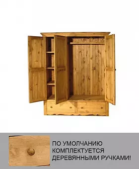Шкаф для одежды 3 двери 2 ящика выполнен из массива сосны, обладает легким ароматом смолы. Неразборный. Вес изделия 175 кг. Состоит из 2 частей: низ с ящикам и верх с дверями. За двумя дверями штанга для одежды, за другой 3 полки для белья. Высота шкафа без нижней части 165 см. высота нижней части 35 см. Ручки деревянные "Грибок" (7 шт.). Тон мебели может отличатся от фотографии на сайте. При желании можно приобрести кованные металлические ручки в форме кольца или груши.