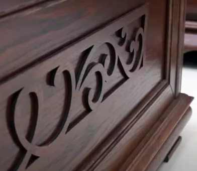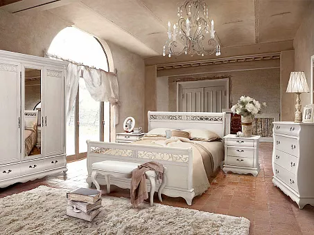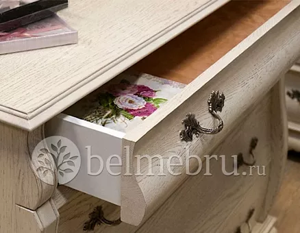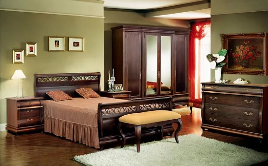 Изогнутые линии, искусно вырезанное кружево из дерева, налёт старины делают спальню безупречно красивой, солидной, удобной. Кроме классического варианта — шкаф, кровать, тумба прикроватная, комод, здесь Вы найдёте и многофункциональный туалетный стол с трёхстворчатым зеркалом – трильяж, и банкетку, и сундук на котором приятно сидеть и можно хранить постельные принадлежности.