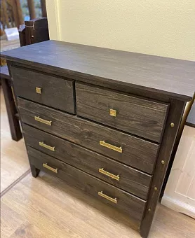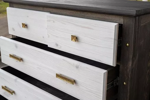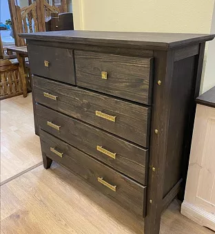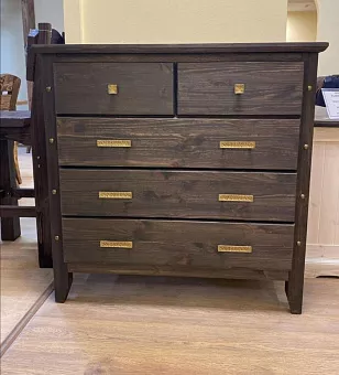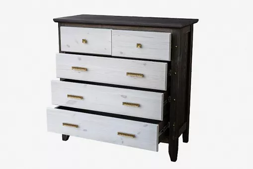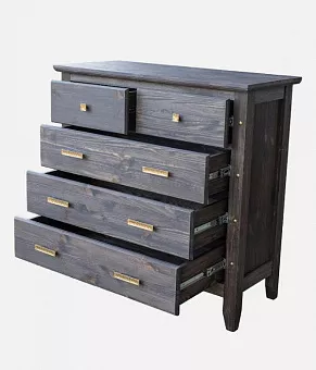 Мебель серии Калифорния изготовлена из натурального массива сосны. Комод имеет пять выдвижных ящиков. Изготавливается в 7 различных цветах: дуб, махагон, зелёный,африканский венге, прованс (серый), маренго светлый, палисандр. Тон мебели может отличатся от фотографии на сайте.