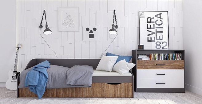 Цветовая палитра коллекции Мальма: белый, графит, Дуб Стирлинг. Спокойные оттенки мебели помогут избежать лишнего визуального шума в интерьере.