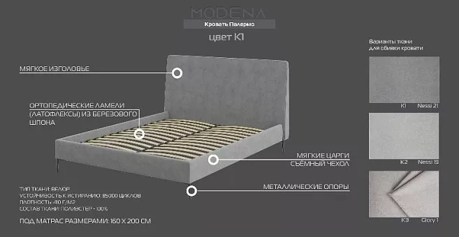 Кровать: мягкая кровать, тип ткани: велюр, плотность: 410 г/м2,