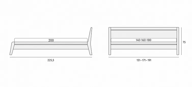 Высота изголовья — 750 мм; высота от пола до верхнего края царги – 350 мм; высота от пола до нижнего края царги – 155 мм; глубина — 2255 мм.