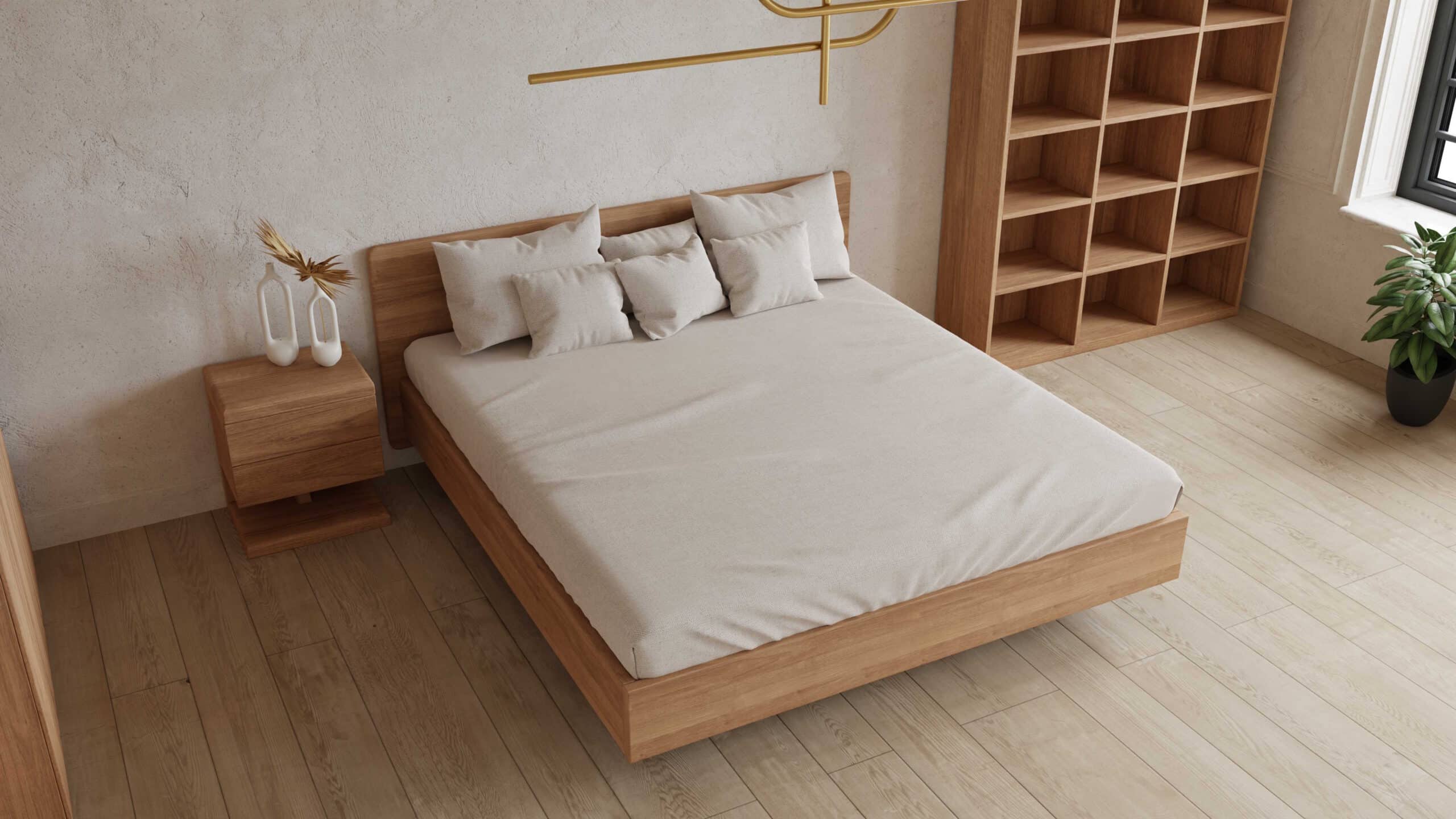 Кровать коллекции «Паола» изготовлена из массива дуба рустик с сучками толщиной 40 мм, что делает кровать массивной и основательной. Благодаря изысканной конструкции, кровать выглядит невесомой и свободно парит в комнате. Кровать изготавливается с ламельным настилом. Высота изножья кровати: 380 мм.