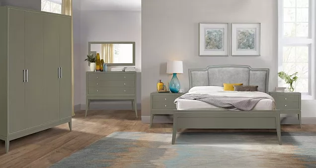 Этому набору характерны изящество линий и лаконичность форм неоклассики в сочетании с благородством и долговечностью древесины дуба. Прямые линии фасадов подчёркивают изящество высоких изогнутых ножек. Центром и основой композиции этого набора является кровать с выверенными аристократичными линиями спинок и мягким элементом в изголовье. Нешаблонный цвет «Оливия» с использованием белой патины подчёркивает современность изделий.