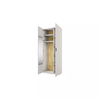 Шкаф 2D Z MODERN. Такой функционал может быть подключен в любой комнате (прихожая, молодёжная/детская комната, гостиная, спальня, гардеробная зона) как самостоятельный предмет шкафной группы, а также, как составляющая шкафной композиции, так как в коллекции представлены элементы с такой же глубиной и высотой. Конструкция шкафа 2D MODERN прямая, представляет одно отделение, которое делится внутренней перегородкой; представлено две полки ЛДСП, выдвижная штанга, полки ЛДСП справа. Двери (2D) распашные, крепятся на петли к боковому корпусу изделия. На внутренней стороне одного из двух фасадов крепится зеркало (Z). Особенностью элемента, да и коллекции в целом, является возможность составлять предметы мебели по возможности площади и конструкции помещения, устанавливать предметы на расстоянии друг от друга либо вплотную.