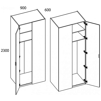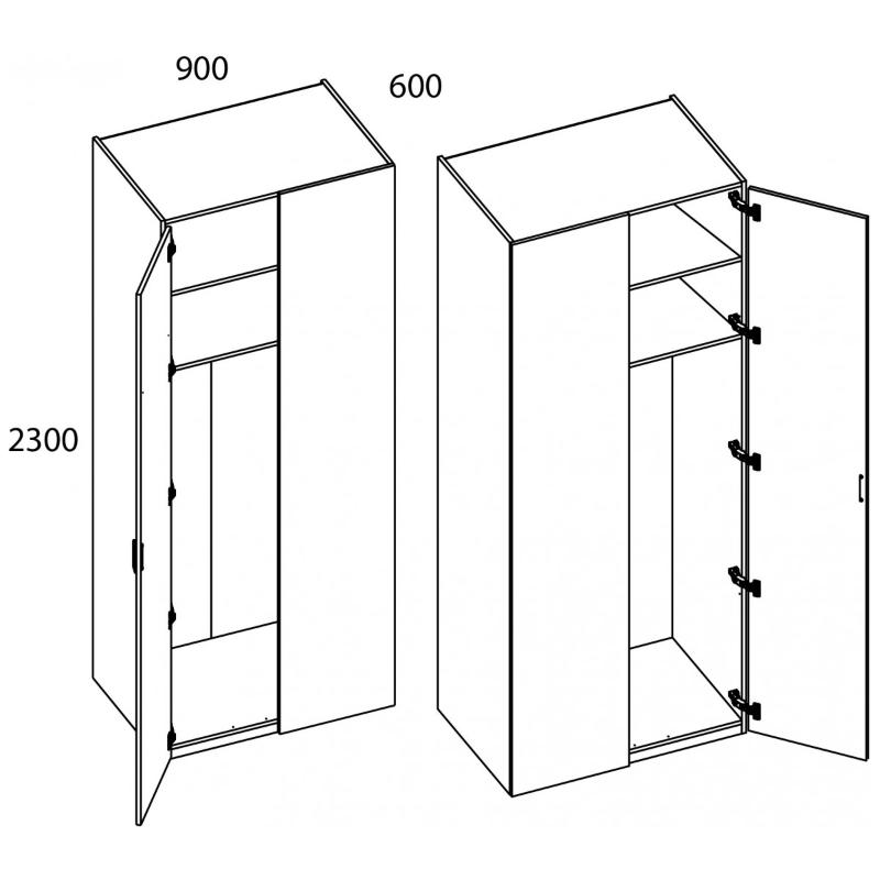 Шкаф 2DG/K90 MODERN. Конструкция данной модели позволяет оформить угловые шкафные группы для большей оптимизации пространства. Можно установить в любом помещении по функционалу – гостиной, спальне, молодёжной/детской комнате, прихожей или гардеробной зоне. Конструкция шкафа 2DG/K90 MODERN прямая, представляет одно отделение с двумя полками ЛДСП и стационарной штангой за одной глухой дверью и стенкой передней (стационарная). Дверь распашная, крепится на петли к боковому корпусу изделия. Угловая композиция получается за счёт присоединения элементов шкафной группы глубиной 600 мм к стенке передней посредством крепежа. Особенностью элемента являются глубокое гардеробное отделение, стильность, использование петель с доводчиками, высота – 2300 мм, установка угловой группы, практичная матовая текстура – персидский жемчуг.