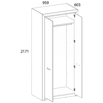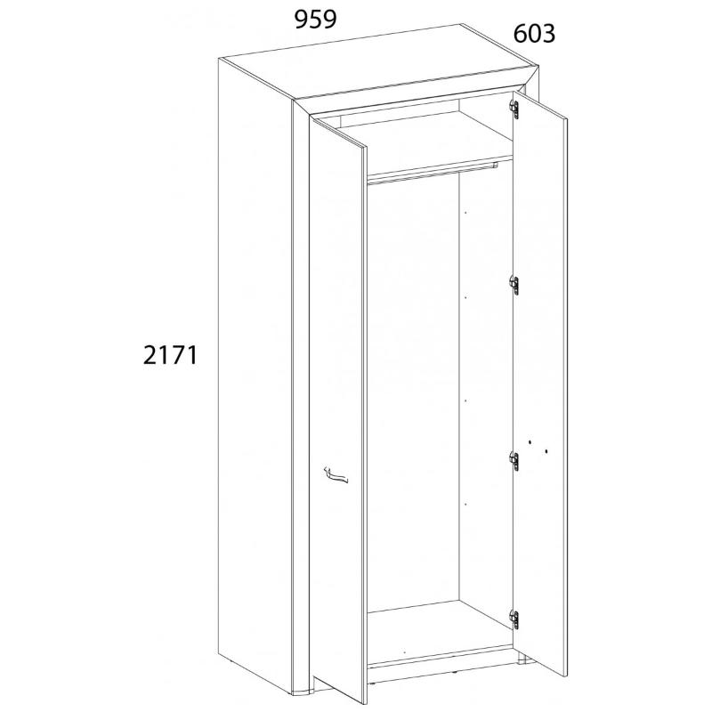 Шкаф 2DG OLIVIA – универсальный предмет мебели, который организует место для хранения вещей в интерьере спальни, молодёжной и гостиной. Расширить функционал элемента можно за счёт дополнительного комплекта полок с одной короткой штангой. Шкаф 2DG имеет прямую конструкцию. Конструкция элемента представляет собой одно гардеробной отделение с одной длинной стационарной штангой и нишей сверху за двумя глухими дверями (2D). Двери распашные, крепятся на петли к боковому корпусу изделия.