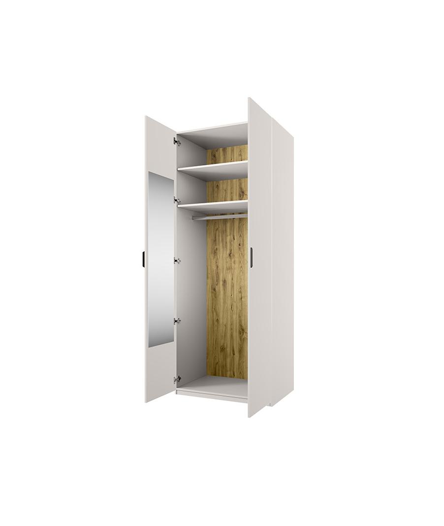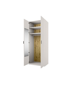 Шкаф 2DG Z MODERN – организатор хранения предметов одежды, быта в спальне, молодёжной комнате, прихожей. Конструкция шкафа 2DG прямая, представляет одно гардеробное отделение (G) с двумя полками ЛДСП и одной стационарной штангой за двумя глухими дверями (2D). Двери распашные, крепятся на петли к боковому корпусу изделия. На внутренней стороне одного из двух фасадов крепится зеркало (Z). Особенностью элемента является практичная и приятная матовая текстура – персидский жемчуг, высота элемента – 2300 мм, возможность докупки комплекта ящиков 3S для расширения функционала. С такими элементами коллекции, как шкаф 1DG/1DG Z, шкаф 2DG/K90-2DG/K90 Z может оформлять композиции по возможности площади, так как имеют одинаковую глубину и высоту.