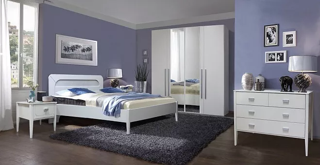Спинка головная кровати, накладки ящиков тумбочки прикроватной и комода включают в себя декоративные узоры.