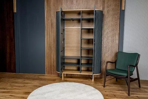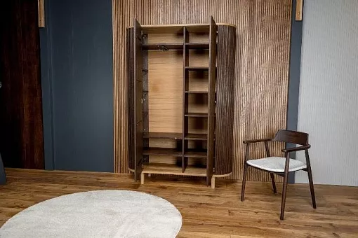 Мебель выполнена из массива дуба с сохранением естественной фактуры древесины. Отделка поверхности выполнена с помощью масла на водной основе, нанесенного втиранием, может быть изготовлена в нескольких цветах на выбор: 10 цветов масел OSMO и 3 цвета эмали. Шкаф имеет две двери, слева - плательное отделение, справа - полки. Петли с доводчиком. Вес изделия 100 кг.