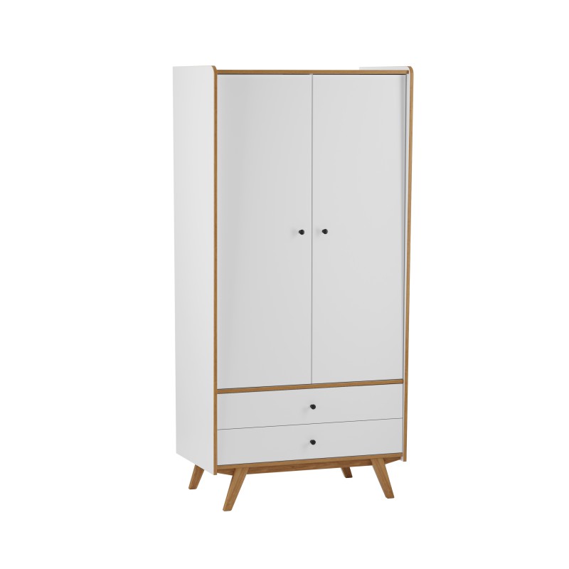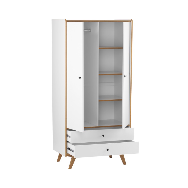 Коллекция "Винтаж" представлена предметами спальни и подростковой комнаты. Производится из массива сосны в трех цветовых вариантах: белый лак, белый лак/браун, серый лак/браун. В варианте белый лак/браун и серый лак/браун в коричневый цвет окрашены торцы корпуса, торцы внутренних полок, ножки предметов. Основная особенность коллекции - окраска плоских поверхностей происходит вальцовым методом, материалами ультрафиолетового отвердения. При таком способе нанесения краски покрытие получается идеально ровным, структура дерева почти не видна. Выдвижные ящики коллекции на шариковых направляющих с доводчиками закрывания. Петли дверей также с доводчиками закрывания. Боковины и задняя стенка выдвижных ящиков окрашены в цвет корпуса. Шкаф Винтаж 2 двери 2 ящика белый лак/браун: шкаф имеет 2 ящика на шариковых направляющих с доводчиками и 2 дверки. Закаждой правой дверкой расположены три полки, за левой дверкой расположена штанга. Петли дверей с доводчиками. Покрытие - укрывистый белый лак, структура древесины почти не просматривается.