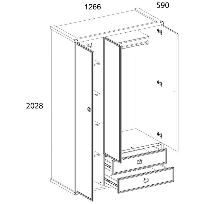 Шкаф 3DG2S MAGELLAN. Восхитительная коллекция с нотами таинственности и загадки. Коллекция MAGELLAN создаст в интерьере целый сюжет в морском стиле. Шкаф 3DG2S – оригинальное и продуманное решение для организации хранения вещей в спальне. Прекрасно подойдёт для помещений с низкими потолками, не будет перегружать пространство, так как высота изделия – 2028 мм. Шкаф 3DG2S имеет прямую конструкцию. Конструкция элемента представляет собой одно гардеробное отделение с нишей за двумя глухими дверями, одно отделение со стационарной штангой и полками из ЛДСП за глухой дверью, два вместительных выдвижных ящика (2S). Двери (3D) – распашные, крепятся на петли к боковому корпусу и внутренней перегородке. На внутреннюю сторону центральной двери крепится зеркало.