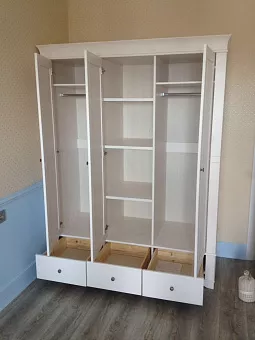 Шкаф имеет 3 отделения: правое и левое отделения с полкой и штангой под полкой, среднее отделение имеет 3 полки, которые регулируются по высоте. Под каждой дверью имеется выдвижной ящик на роликовых направляющих. Дополнительно можно приобрести встраиваемые полки (арт. 87409) в левое или правое отделение.