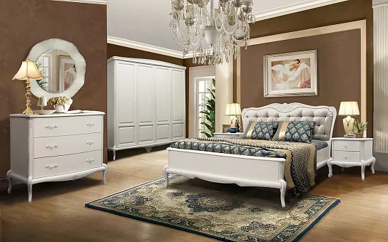 Набор выполнен с использованием массива дуба и бука, а так же шпона лиственных пород на лицевых поверхностях. Украшает изделия лицевая фурнитура, подобранная в тон к цвету изделия, витиеватая резьба, объёмный вид накладок ящиков.