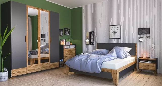 Фасад выполнен из ЛДСП в двух цветах: Белый/Дуб Вотан, Графит/Дуб Вотан.
