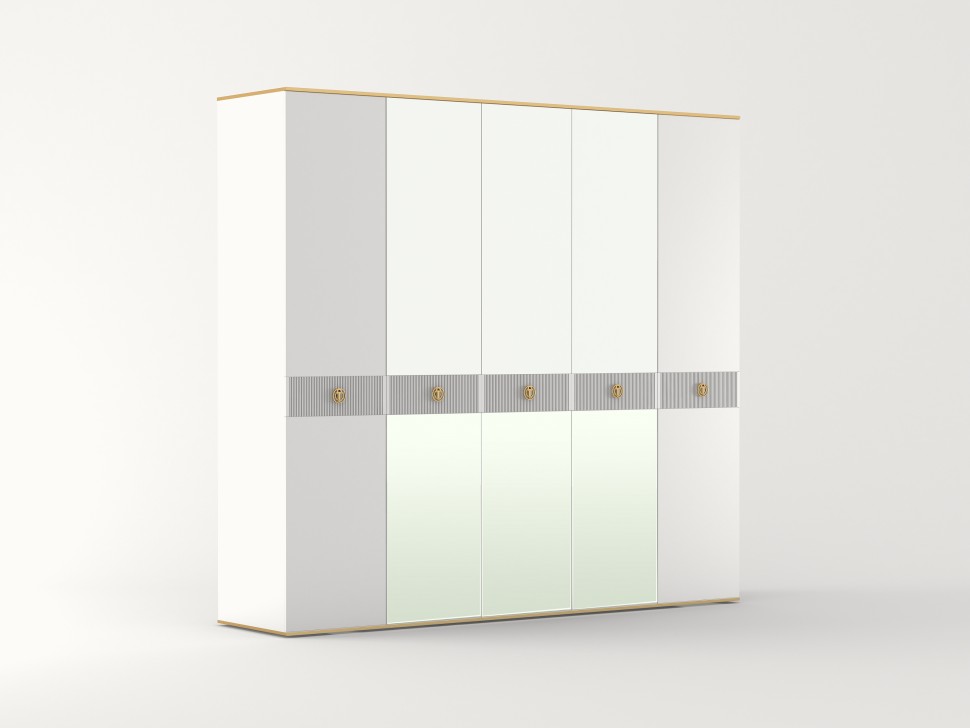 Шкаф 5-ти створчатый Глория выполнен из МДФ, в современном стиле. Крашения M11 (белый) и M18 (ваниль) с золотой или серебрянной патиной, но если патина серебро, то ручки только заказные за доплату. Шариковые направляющие BOYARD полного выдвижения, ящики из фанеры в лаке прозрачном. Дополнительно возможна установка с доводчиками. Ручки металлические. Возможно изготовление в нестандартном размере, подробности уточняйте у менеджеров.
