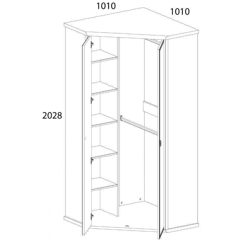 Шкаф угловой 2D MAGELLAN решает множество задач интерьера – позволит освободить дополнительное пространство в помещении, сделает его более эргономичным, скроет недостатки комнаты и сделает её уютной, вместит большое количество вещей, просто украсит интерьер. Шкаф угловой 2D имеет пятиугольную угловую форму. Конструкция элемента представляет собой одно большое гардеробное отделение с двумя стационарными штангами и полками из ЛДСП (расположение слева) за двумя дверями (2D). Двери распашные, крепятся на петли к боковому корпусу изделия.