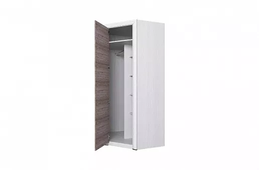 Безошибочно оформит интерьер спальни, молодёжной, прихожей, гостиной (см. размеры). Шкаф с полками 97*97 – угловой, пятиугольной формы. Конструкция элемента представляет собой одно гардеробное отделение за глухой дверью с одной штангой и глубокими полками из ЛДСП (расположение справа) для белья и других предметов одежды. Дверь (1D) распашная, крепится на петли к боковому корпусу.