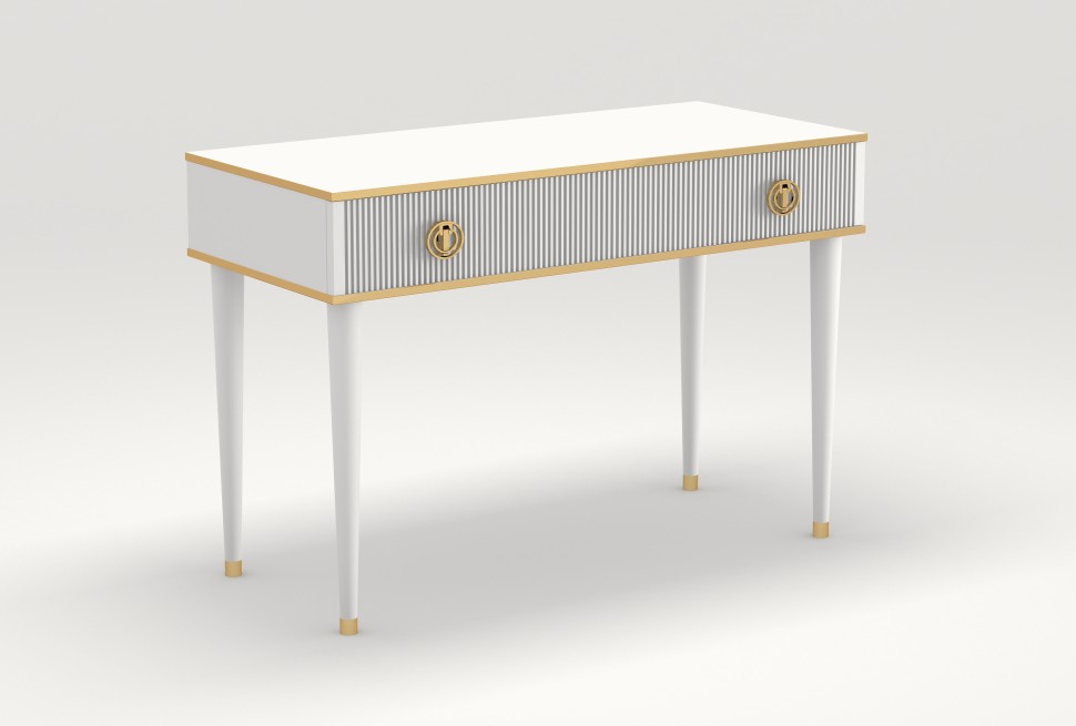 Столик туалетный Глория выполнен из МДФ, в современном стиле. Крашения M11 (белый) и M18 (ваниль) с золотой или серебрянной патиной, но если патина серебро, то ручки только заказные за доплату. Шариковые направляющие BOYARD полного выдвижения, ящики из фанеры в лаке прозрачном. Дополнительно возможна установка с доводчиками. Ручки металлические. Возможно изготовление в нестандартном размере, подробности уточняйте у менеджеров.