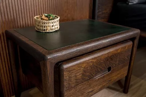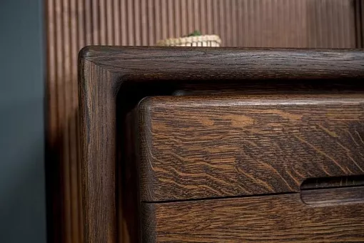 Мебель выполнена из массива дуба с сохранением естественной фактуры древесины. Отделка поверхности выполнена с помощью масла на водной основе, нанесенного втиранием, может быть изготовлена в нескольких цветах на выбор: 10 цветов масел OSMO и 3 цвета эмали. Тумба имеет 2 выдвижных ящика. Вес изделия 25 кг.