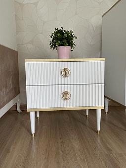 Тумба прикроватная Глория 2 ящика выполнена из МДФ, в современном стиле. Крашения M11 (белый) и M18 (ваниль) с золотой или серебрянной патиной, но если патина серебро, то ручки только заказные за доплату. Шариковые направляющие BOYARD полного выдвижения, ящики из фанеры в лаке прозрачном. Дополнительно возможна установка с доводчиками. Ручки металлические. Возможно изготовление в нестандартном размере, подробности уточняйте у менеджеров.
