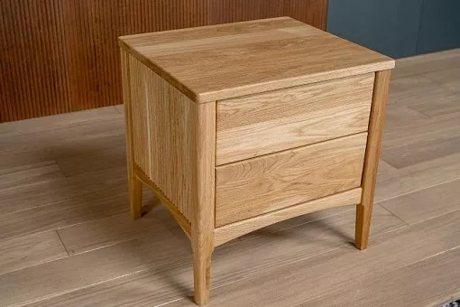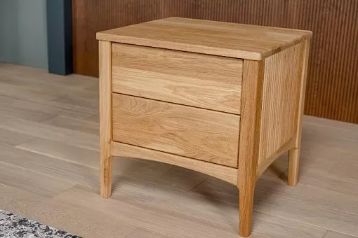 Мебель выполнена из массива дуба с сохранением естественной фактуры древесины. Отделка поверхности выполнена с помощью масла на водной основе, нанесенного втиранием, может быть изготовлена в нескольких цветах на выбор: 10 цветов масел OSMO и 3 цвета эмали. Тумба имеет 2 выдвижных ящика. Вес изделия 25 кг.