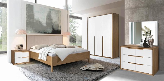 В серию входят кровать, шкаф для одежды, зеркало, тумба прикроватная, комод. Фурнитура: петли и направляющие Boyard (Китай).