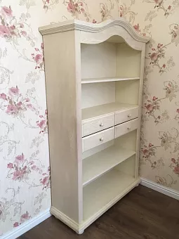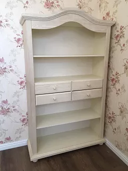 Цвет браширование белый воск патина - в детскую для книг и игрушек неплохо. Вместе со шкафом и письменными столами из этой же серии смотрится гармонично.для нас оказался вполне вместительным, ящики расположены на удобном уровне как для взрослых, так и детей.из минусов: привезли в разобранном виде, хотя на сайте информация,что привозят собранным.и это было для нас не совсем удобно.