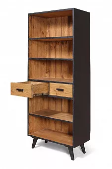 Стеллаж выполнен из массива сосны. Имеет 2 ящичка. Высота ножек 15 см. Все выдвижные ящики серии Эрика на шариковых направляющих,двери - европетли , по-умолчанию металлические ручки, возможно изготовление без отверстий, черным цветом - нанесён чёрный матовый лак. Задние стенки и донышки ящичков - наборная вагонка, сосна. Тон мебели может отличатся от фотографии на сайте.