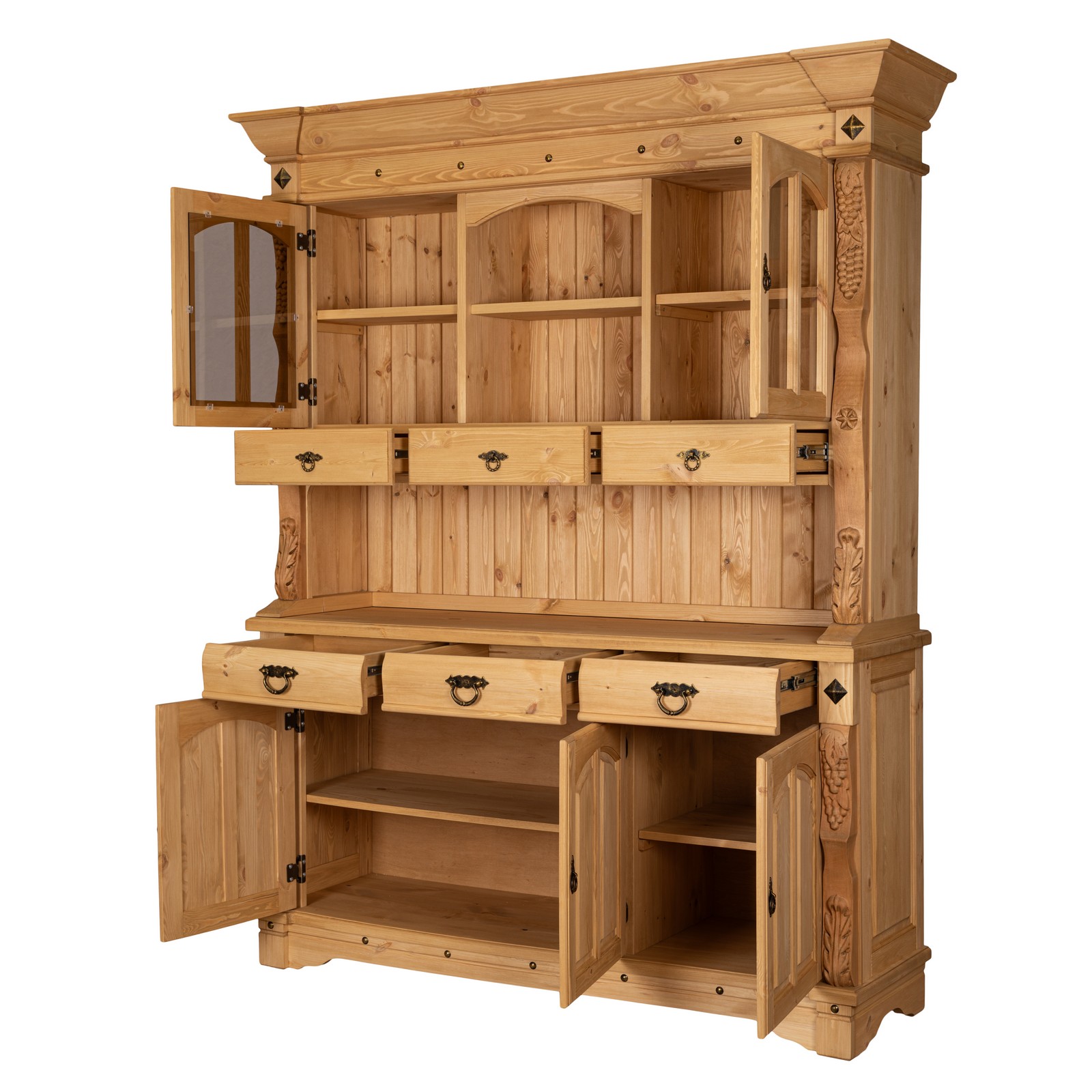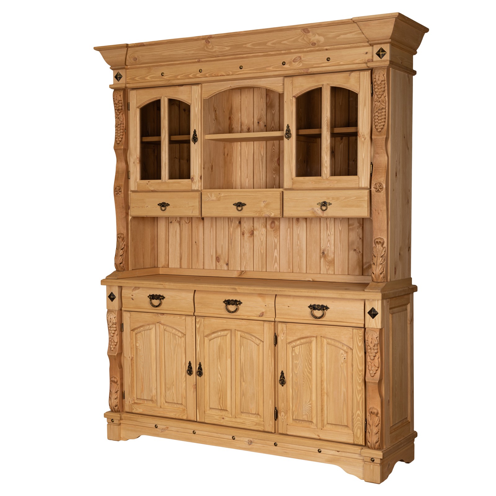 Буфет изготовлен из массива сосны, тонированного в благородные оттенки. Натуральная древесина придаёт изделию теплоту и фактурность, а цвет создаёт изысканный контраст, не перегружая пространство.