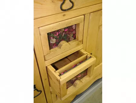 Буфет Волшебная сосна REHAUSSE 125 (RE125+GR125) выполнен из массива сосны, обладает легким ароматом смолы. Состоит из верха RE 125 и низа GR 125. Вес изделия 113 кг. Верх - стеклянные дверцы, за дверками 1 полки, Низ - три выдвижных ящика на деревянных полозках, а также имеется три ящика со стеклом, куда можно засыпать различные декоративные элементы: лепестки цветов, сухоцветы, зерна и т.п., по бокам две дверцы. Комплектуется металлическими ручками "груши" (7шт.). Тон мебели может отличатся от фотографии на сайте. При желании можно приобрести кованные металлические ручки в форме кольца или груши.