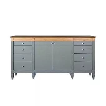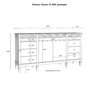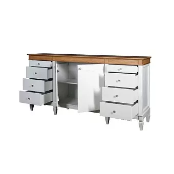 Комод оснащен двумя распашными дверками с полками внутри и восемью ящиками. Фурнитура на дверях и ящиках с доводчиками. Высокие ножки обеспечивают оптимальный доступ при уборке.